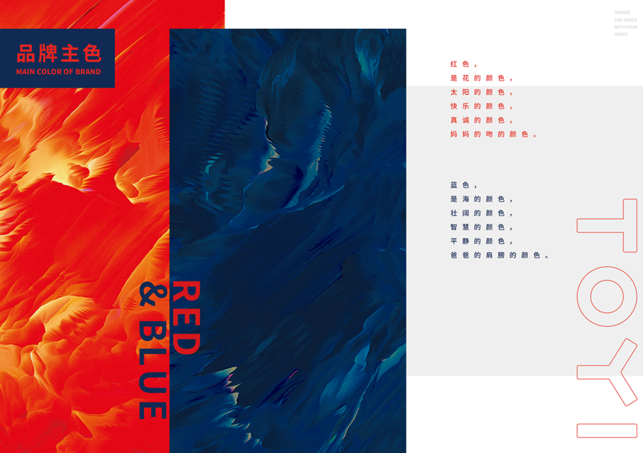 5.品牌色彩:品牌選擇了紅色和藍色作為主色調(diào),這兩種顏色不僅鮮明而且易于辨識,再配上白色和黑色,形成了TOYI童裝獨特的品牌色彩體系。